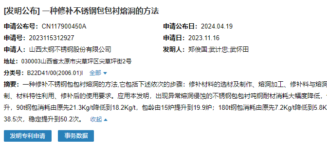 山西太鋼成功申請一項名為“一種修補不銹鋼包包襯熔洞的方法”專利