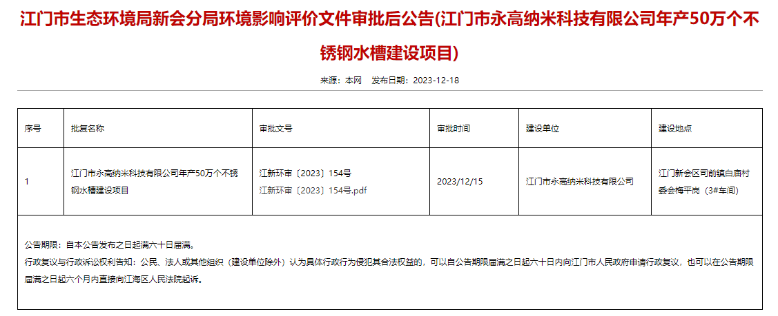 永高納米科技有限公司年產50萬個不銹鋼水槽建設項目環(huán)評獲審批