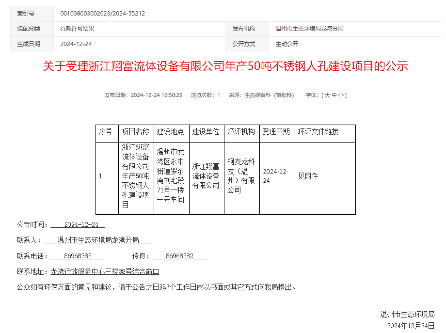 浙江翔富流體設(shè)備有限公司年產(chǎn)50噸不銹鋼人孔建設(shè)項(xiàng)目環(huán)評(píng)獲受理