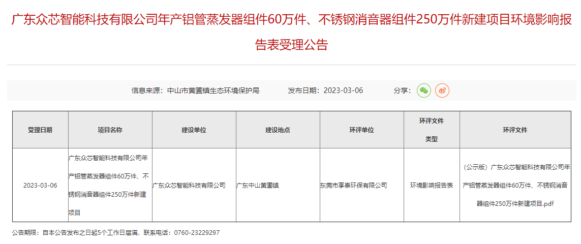 眾芯智能科技公司年產(chǎn)250萬件不銹鋼消音器組件新建項(xiàng)目環(huán)評(píng)受理