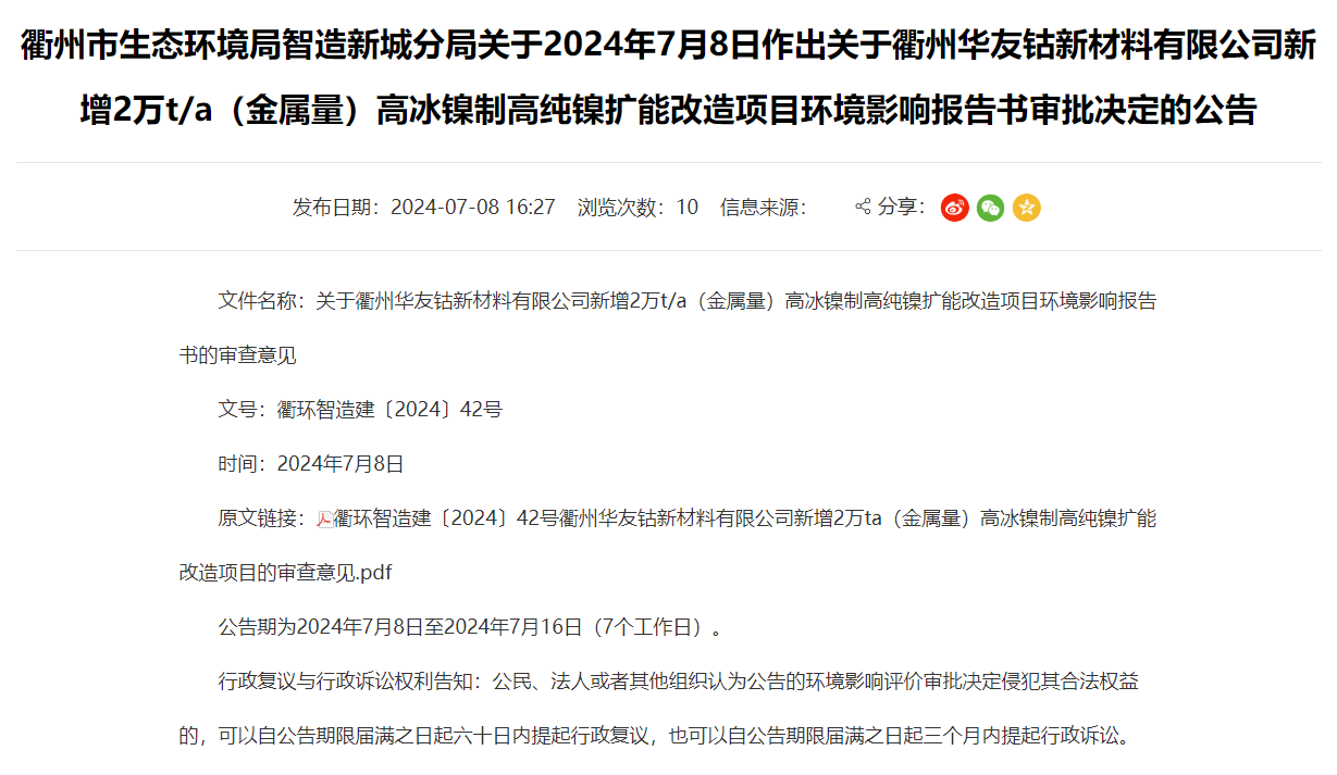 華友鈷新材料新增2萬t/a高冰鎳制高純鎳擴(kuò)能改造項目環(huán)評獲審批